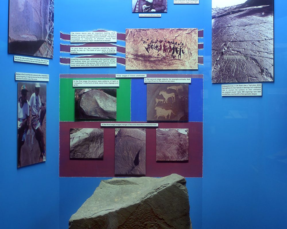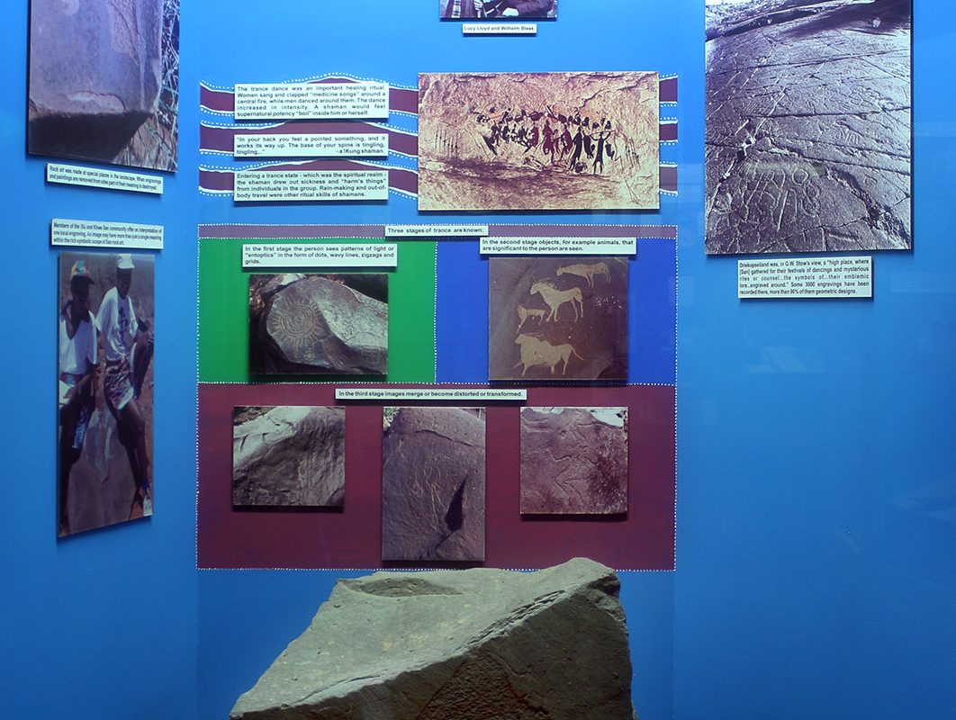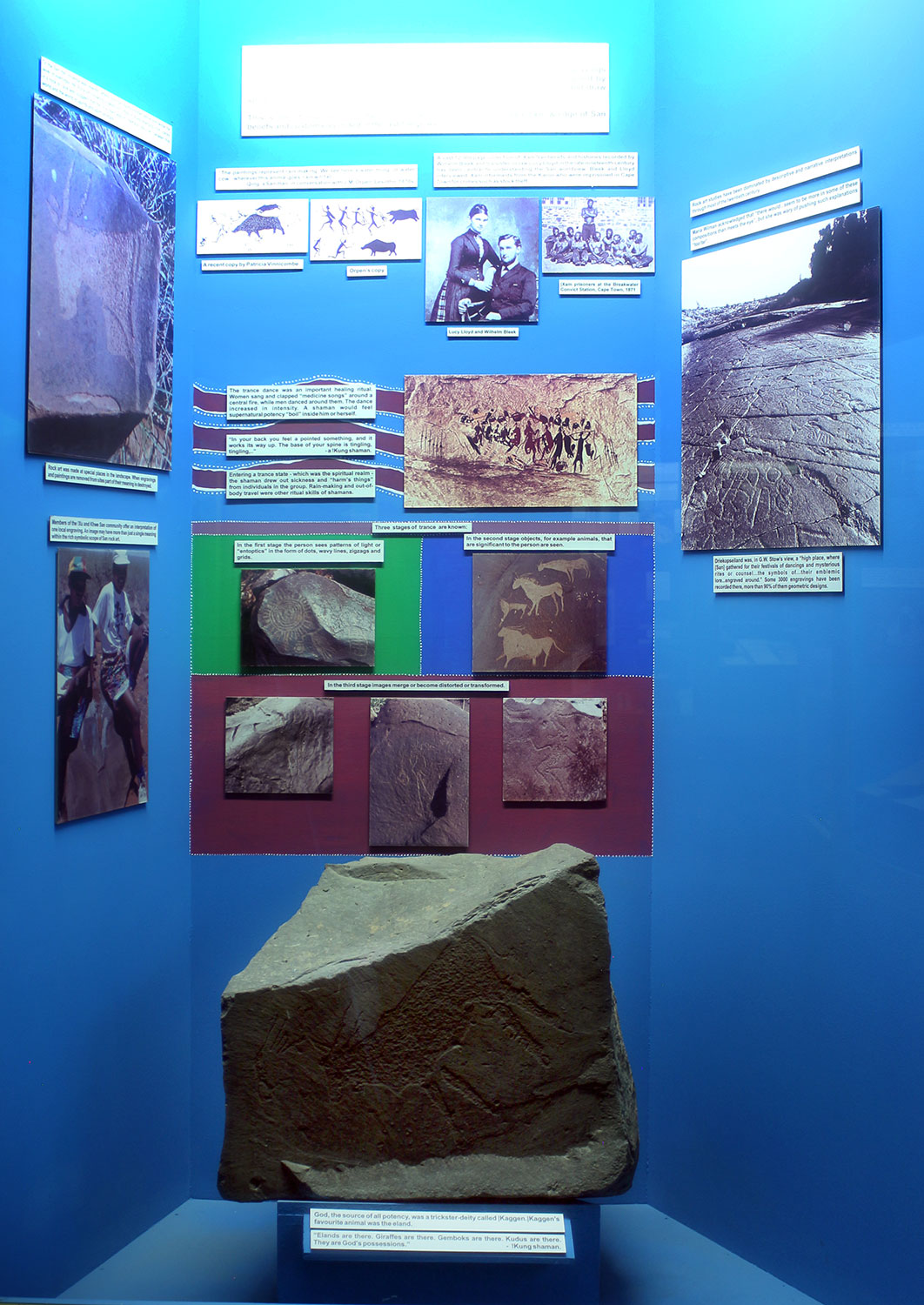 Animal images are a major symbolic element in San art, and they feature, albeit differently, in stories as well. In the art, large game animals predominate, and the eland is evidently a central motif and symbol. Human figures are less common in engravings than in paintings; and men are shown more often than women. Group compositions include dances. But the intent is not narrative. Some images are concerned with transformation, for example depicting humans with animal heads or feet. These particular engravings and paintings, known as therianthropes, most clearly relate to the religious beliefs and ritual trance dances of hunter-gatherers. Complex geometric images, referred to as entoptics, appear to have been inspired by visual experiences during trance. Other geometric images are thought by some to belong to a distinct Khoikhoi tradition – an argument developed since this display was created. The huge site of Driekopseiland, which is dominated by such geometric imagery, has been suggested to relate to coming-of-age rites of young women.